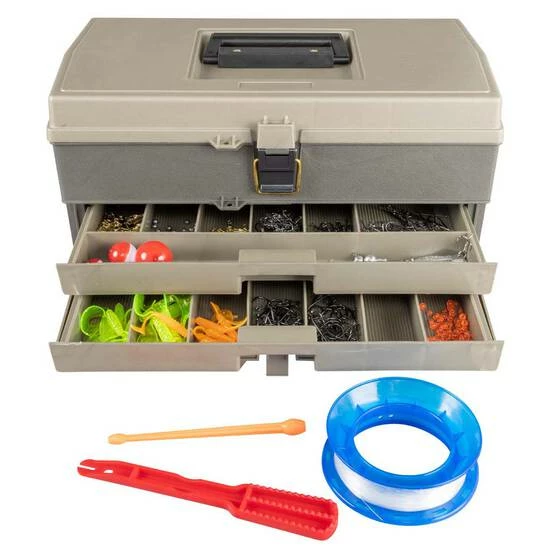 This Plano Tackle Kit is a supreme starter pack that includes everything you need to get fishing. It comes complete with the large Plano 707 tackle box, with plenty of upper storage for hand-casters and reels. This is a large 15-compartment, 2-drawer tackle box, with a life-time manufacturer’s warranty as the ultimate mark of quality. It’s sturdy, too – the brass-bailed lid latch is made tough to stand up to being tossed around on the boat.